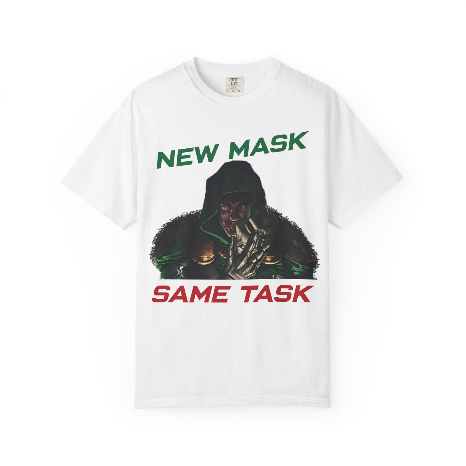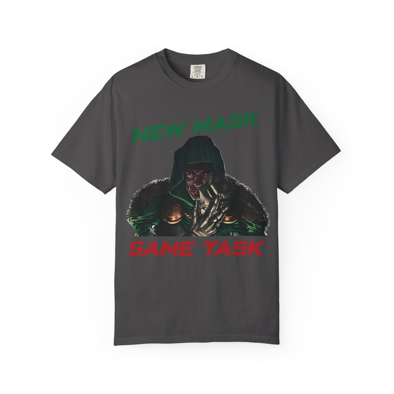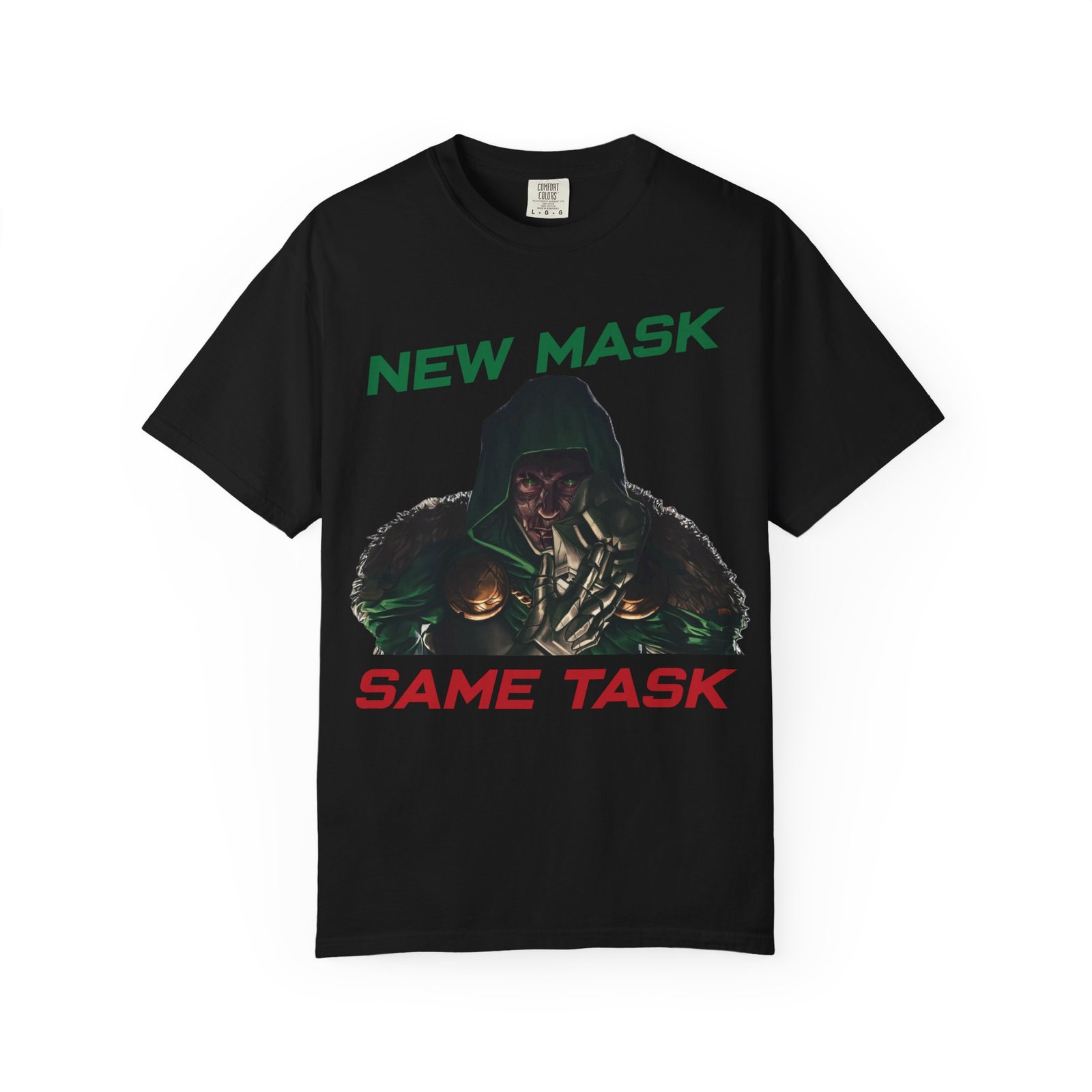 This Marvel-inspired graphic t-shirt captures the essence of two iconic forces in the superhero world — the ruthless intelligence of a masked monarch and the high-tech brilliance of a billionaire in armor. Whether you admire the genius of a certain iron-suited Avenger or the dark dominance of a masked ruler, this design is for you.
