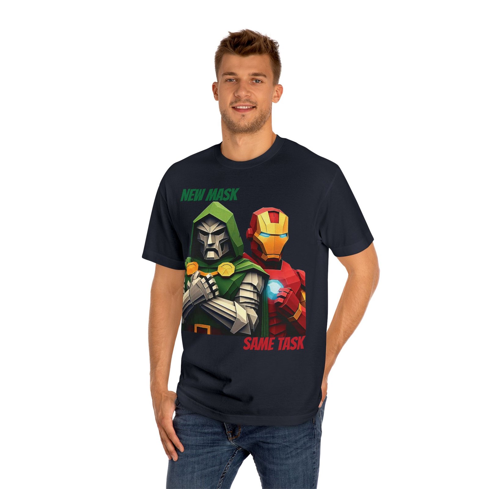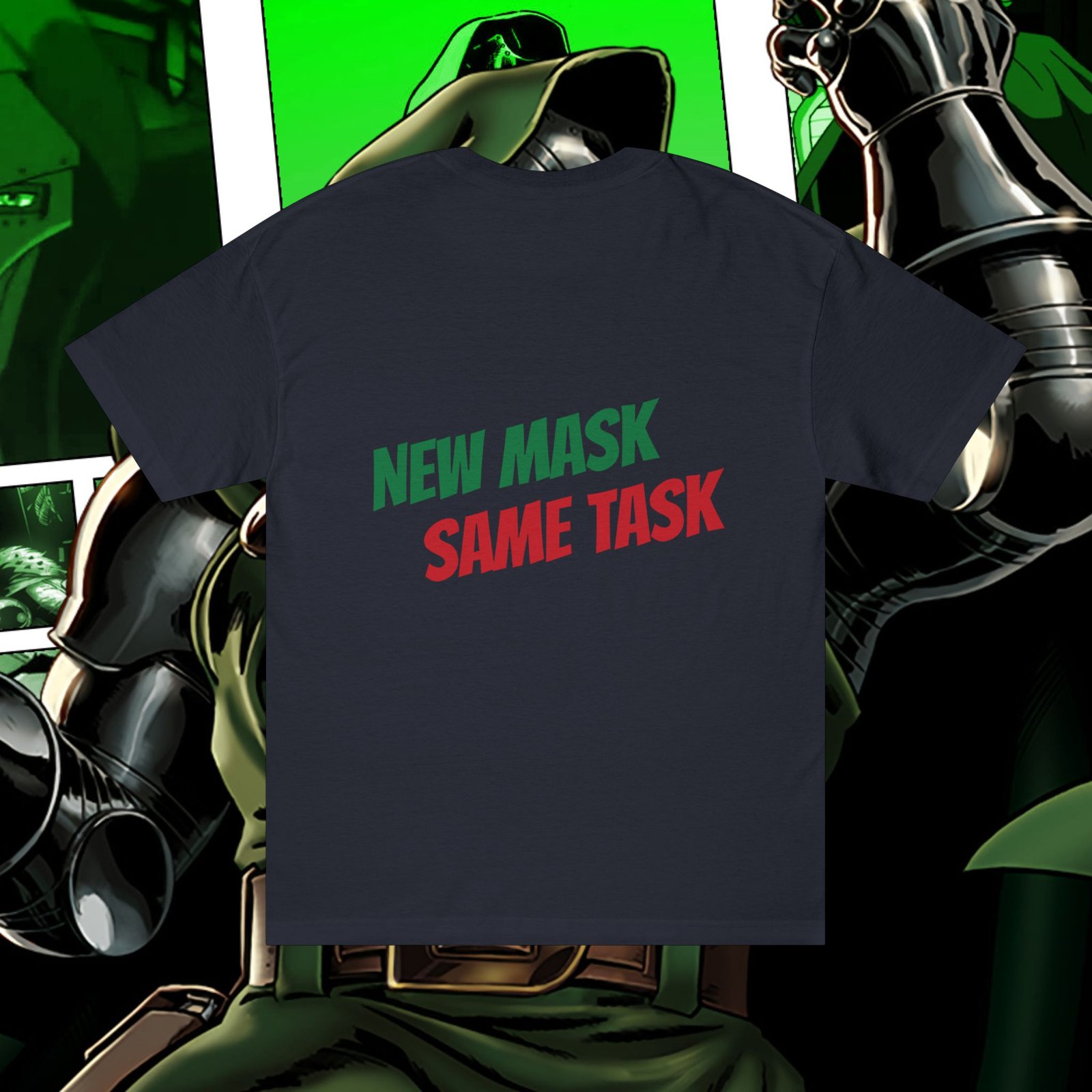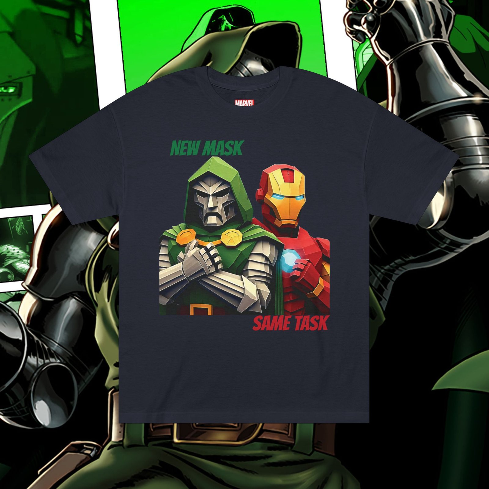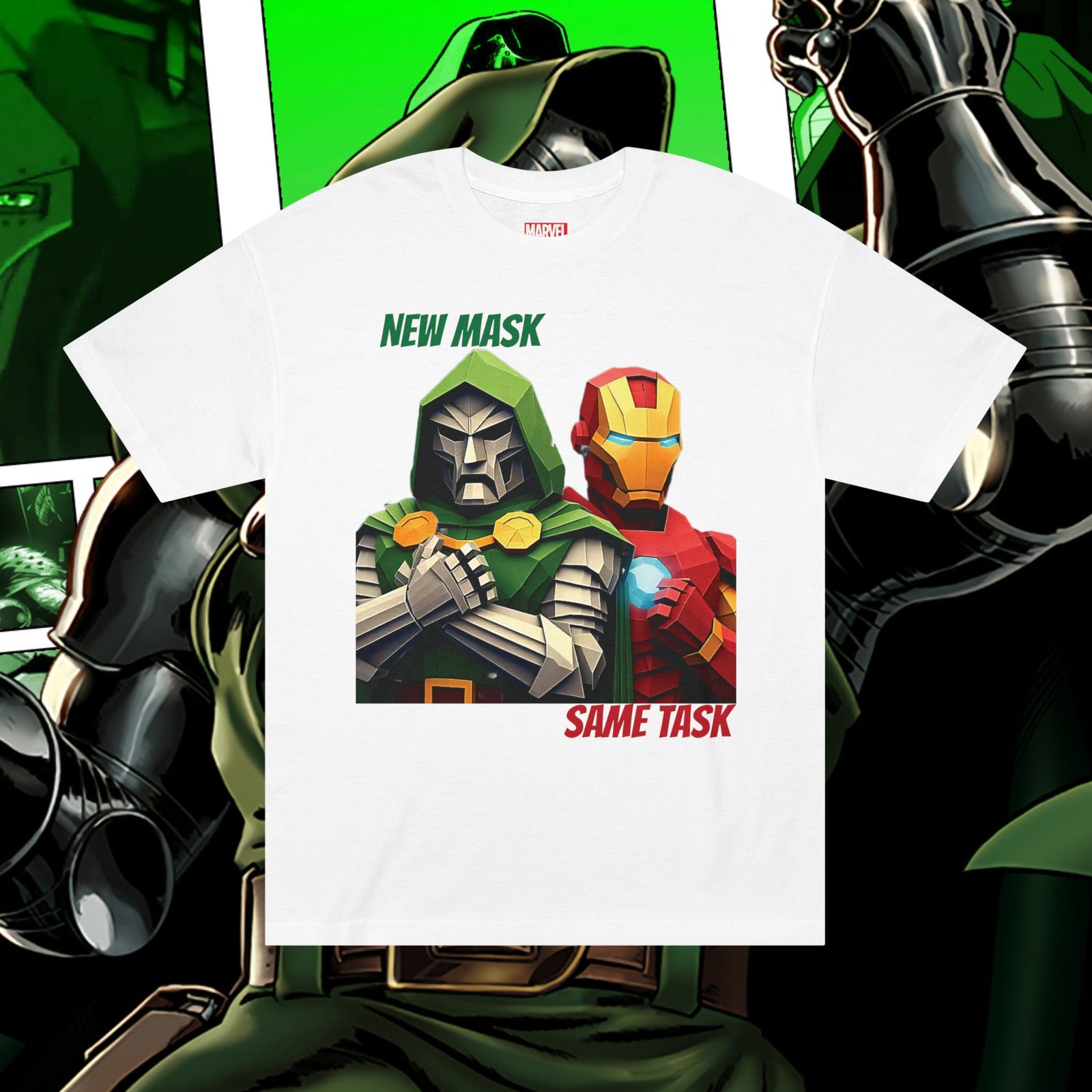 Show your love for classic Marvel characters with this bold unisex graphic t-shirt featuring Iron Man and Doctor Doom. Designed for fans of comic books, superheroes, and iconic rivalries, this shirt makes a powerful statement: New Mask, Same Task.