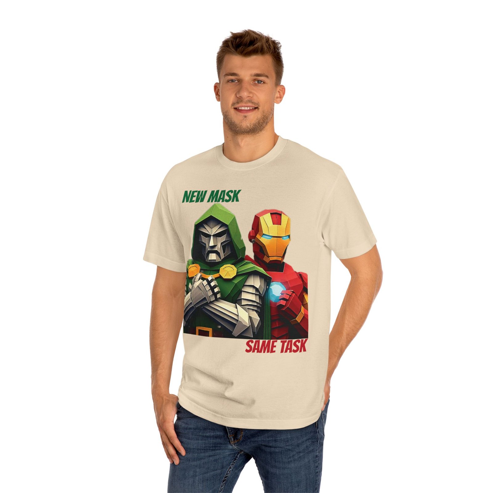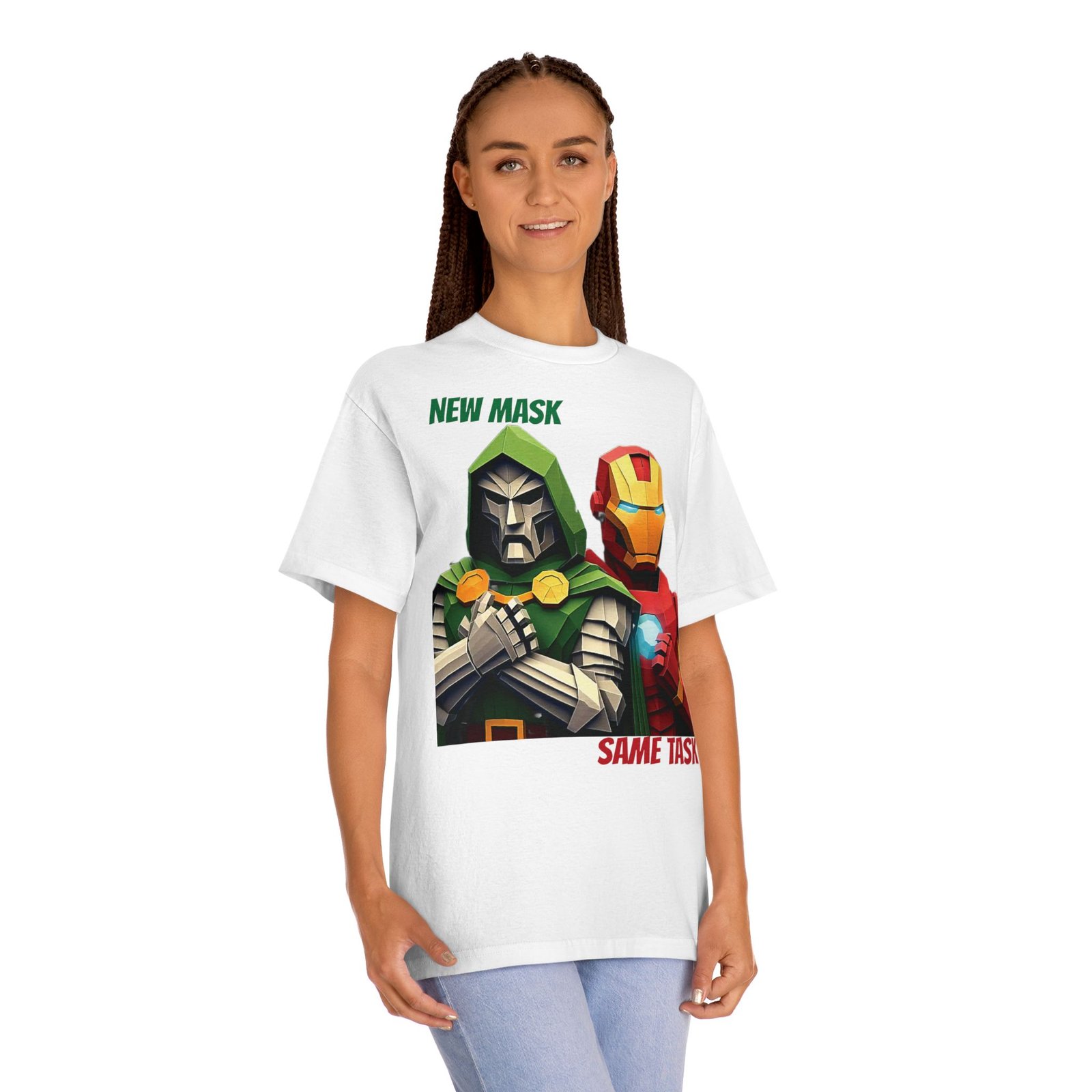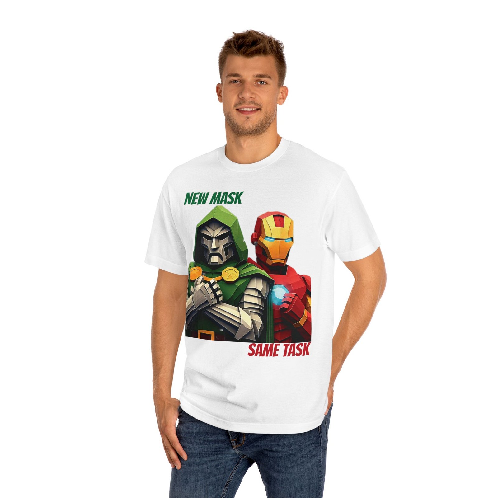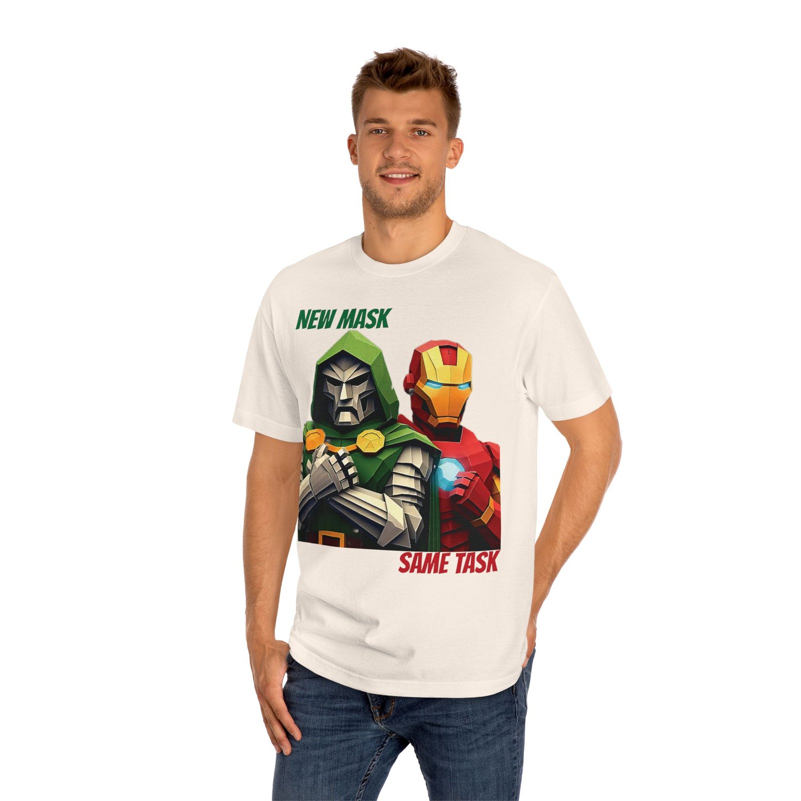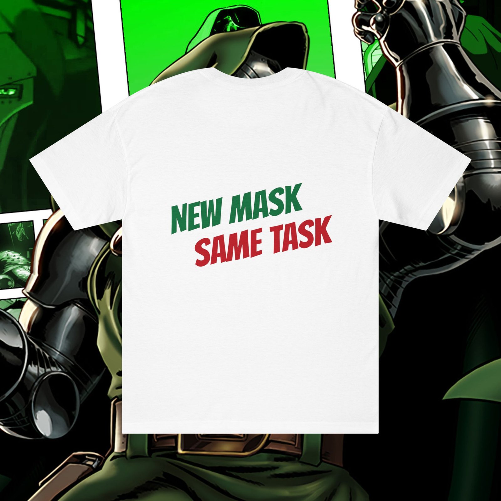Show your love for classic Marvel characters with this bold unisex graphic t-shirt featuring Iron Man and Doctor Doom. Designed for fans of comic books, superheroes, and iconic rivalries, this shirt makes a powerful statement: New Mask, Same Task.